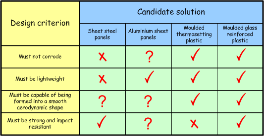 Ergonomics: The term ergonomics comes from two Greek words “ergo” meaning “a task” and “nomos” meaning “a law or a rule”. Ergonomics (sometimes also known as human engineering) is the study of how the human body relates to its environment. When considering design solutions we need to give some thought as to how human beings (i.e. end-users) will interact with what it is that we are designing! Evaluation matrix: One good way of comparing a set of candidate solutions is the use of an evaluation matrix. This is simply a table that lists the design criteria (in rows) and each of the candidate solutions (in columns). When you construct an evaluation matrix you put a mark or a score in the cells corresponding to your assessment of each candidate solution against each criterion. The example below is a simple evaluation matrix used for selecting the material used for the body panels of a high-performance racing motorcyle. The ticks indicate that a particular criterion is satisfied whilst the crosses indicate that it is not satisfied. The question marks are used where some doubts might exist or where the criterion can be satisfied with some difficulty (for example, aluminium and steel panels would need to be formed into the required aerodynamic shape).