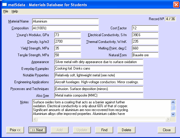 Although the database has already been populated with data it has been designed so that you can easily modify the data or add your own data to it. When you first start the matSdata application it will load the data from the disk file (matSdata.dat) and you will then see a window that looks something like the one shown below. You will then be able to view, modify and search the database. Comprehensive help is available from the Help menu.